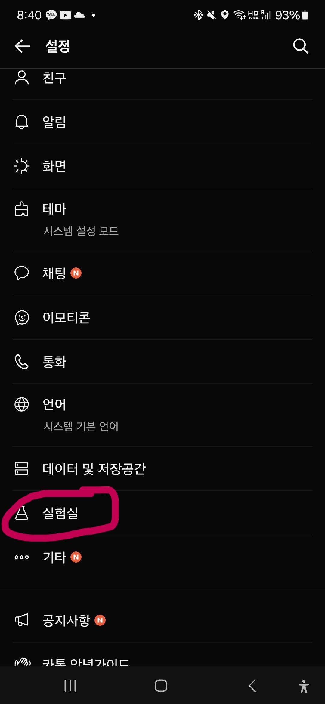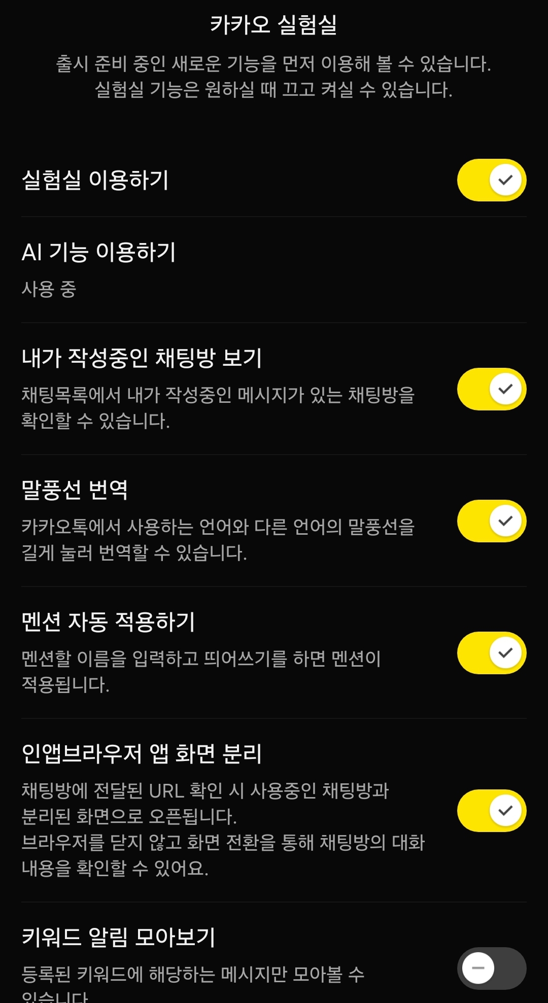 카카오톡 설정에서 ‘실험실’ 메뉴에 들어가 원하는 기능을 활성화할 수 있습니다.